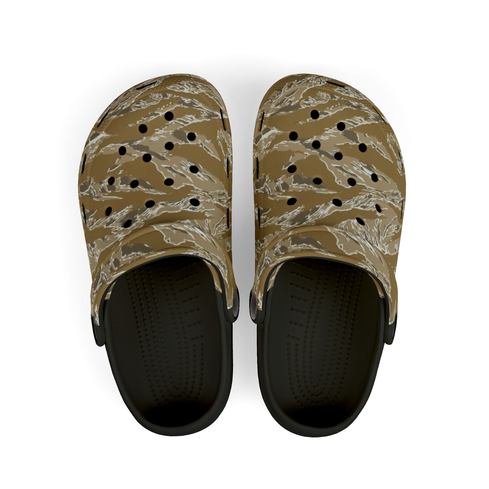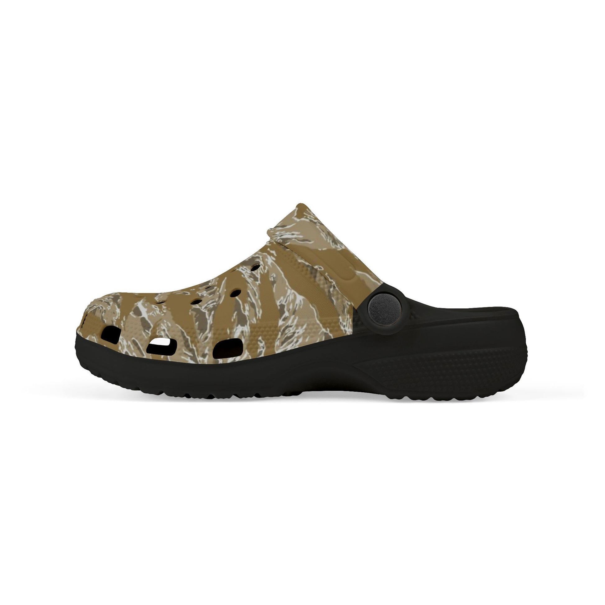 These lightweight EVA clogs bring easy, everyday comfort with a rugged, camo-inspired print. Molded to follow the curve of a child’s foot, they offer flexible cushioning through a full 100% EVA construction that feels springy but supportive during playground rambles, muddy garden explorations, or backyard barbecues. The printed upper and strap give each pair personality, while the black or white insole/outsole choices keep the look grounded. Small charm accessories arrive with each order for playful customization. Built for active kids who want easy slip-on footwear that stands up to rough-and-tumble days.