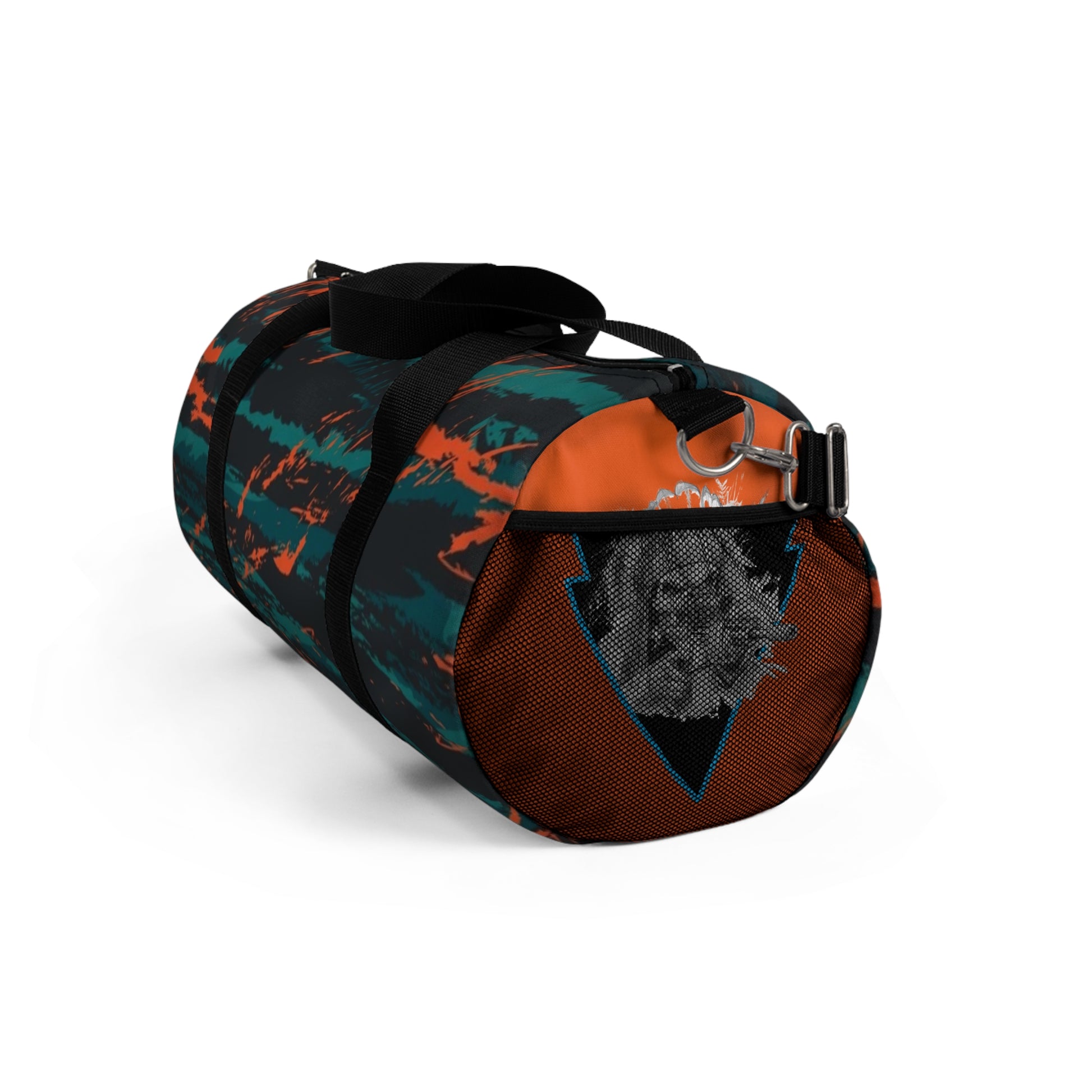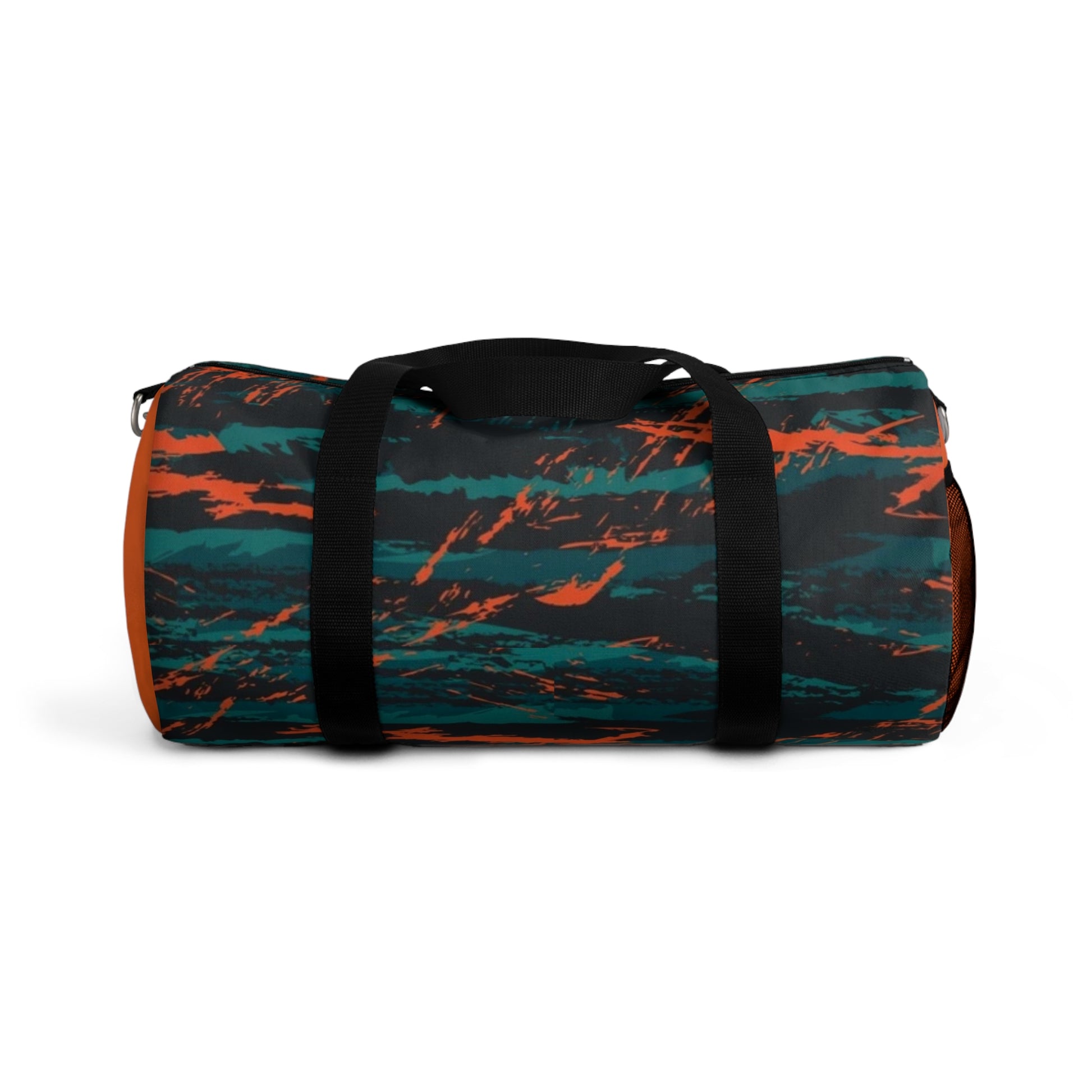 This compact duffel carries the restless energy of late-night drives and shoreline bonfires. The rugged polyester Oxford shell holds its shape while resisting damp and wear. Inside, a zippered pocket with a sewn name tag keeps essentials organized and easy to find; an external mesh side pocket holds a water bottle or wet towel. The adjustable, removable shoulder strap with a padded section and brushed nickel hardware lets you sling it on and go. The muted teal and burnt-orange streaked design feels outdoorsy and artistic — a bag that moves from gym sessions to weekend escapes without fuss.